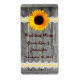 Country theme wedding mini wine / champagne bottle label done in a rustic weathered wood fence look. Graphics of ivory eyelet ribbon with a band of yellow and white gingham stretches across the top and bottom of the label, with a big sunflower bloom, on the top ribbon. Text, in dark brown, is fully customisable and ready to personalise for your special day. Great for your wedding reception table or gift wines.