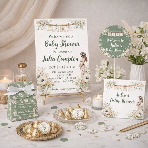A warm and welcoming baby shower design featuring gentle pastel florals, a twine‑hung “BABY” banner, and an elegant illustration of an expectant mother. The reverse side includes a coordinating green floral print for added charm and versatility. Ideal for a wide range of baby shower themes with a soft, nature‑inspired aesthetic.