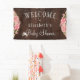 Rustic country baby shower welcome sign banner with blush pink peonies on brown barn wood background with string lights. Ideal for your summer garden backyard autumn fall rustic country baby showers.