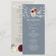Guide your guests through your big day with this elegant dusty blue wedding program featuring burgundy and ivory florals, string lights, and a mason jar monogram. A beautiful way to highlight your ceremony details and bridal party while matching your entire wedding suite.
