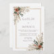 This rustic floral wedding invitation features a beautifully balanced corner arrangement of soft watercolor blooms in warm earthy tones—terracotta, ivory, and sage green—framed with an elegant double gold border. The minimalist white background keeps the design clean and timeless while allowing your personalised text to be the focal point.