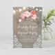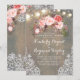 Rustic barn / farm engagement party invitations features an amazing pink floral bouquet, string of lights, lace, and wood.