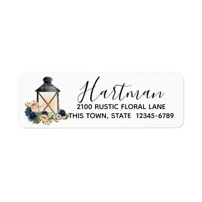 Rustic lantern and roses, watercolor floral bouquet return address label to compliment our wedding invitations or use for any occasion. Navy blue and blush floral with editable hand script fonts.