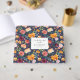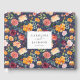 This pretty floral guest book features watercolor flowers against a navy blue background. The flower pattern includes burgundy and peach roses, marsala dahlias, and yellow buttercups. Add your names and wedding date to the name plate on the front.
