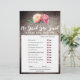 This rustic flower bouquet "he said she said" quiz game is perfect for a floral country theme bridal shower. The front of the game card features "he said she said" which is a fun quiz about the bride and groom. The back of the card features a word find with wedding related words and phrases. The design features an elegant arrangement of blush pink watercolor peonies on a wood textured background. Personalise the game card with the brides name and wedding shower date.