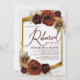 Wedding rehearsal dinner invitation features rustic oil painted burgundy earthy toned autumn fall flowers over greenery and pampas grass with an elegant gold foliage frame and background.