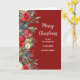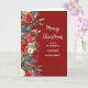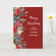 Merry Christmas for cousin and his family card with rustic country design, burgundy red background and winter foliage with poinsettias.