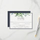 Rustic Forest Foliage, wedding RSVP cards with meal choice option. Design features delicate watercolor greenery in shades of green and blue, navy blue colour backing and border frame. Modern and elegant typography design style template.