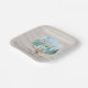 BOY baby shower version. Coordinating paper plates are part of the paper party decor products that match this invitation suite. Soft gray wooden background with watercolor artwork of mountains, forest and cute woodland animals with bow ties and a dusty blue tent, on a camping trip! Script calligraphy typography text finishes off the design. Art painted by internationally licensed artist, Audrey Jeanne Roberts, copyright.