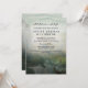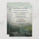 Hunter themed celebration of life invitation with a deer standing by a pond in a glade surrounded by a forest, with printed watercolor texture and a misty morning look with a rustic feel.