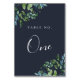 Modern and elegant typography design, navy blue table number card. Card features rustic watercolor forest foliage in shades of green and blue. When ordering table number cards, each card must be numbered and ordered individually.