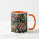 Coffee Mug in Rustic Fruit & Floral design. Shades of orange, peach, green, and blue on a black background. Orange handle and interior.