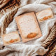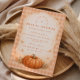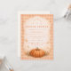Warm harvest tones meet romantic florals in this elegant autumn bridal shower design. A richly painted heirloom pumpkin is surrounded by soft peach blooms, delicate greenery, and golden fall foliage, creating a refined seasonal frame. The airy parchment background and arched botanical detail give the layout a timeless, feminine feel while still embracing cozy fall charm.