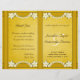 Rustic Gold Floral © Sunny Mars Designs. Unique classy formal fully customisable custom vintage rusty blue elegant foldable wedding program template with gold ribbon borders, modern pretty white flowers on old parchment paper background.