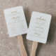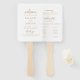 This rustic gold script wedding program hand fan is perfect for a country wedding. The simple and modern gold and white design features unique whimsical handwritten calligraphy lettering with a contemporary minimalist boho style. Customizable in any color. Keep the design minimal and simplistic, as is, or personalize it by adding your own graphics and artwork. Include the name of the bride and groom, the wedding date and location, thank you message, order of service, and bridal party. Order your programs assembled or non-assembled.