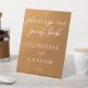 This rustic gold wedding pedestal sign features elegant white typography overlaid on an understated earth tone gradient. Simple light orange and brown hues follow the current fall trends for a bohemian wedding this autumn. Please sign our guest book. Complete the look with your minimalist script over the colour fade.