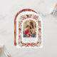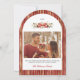 Celebrate the season with timeless elegance and a touch of Grandmillennial charm with this beautifully detailed Christmas photo card. An arched photo frame is surrounded by a ribbon-wrapped garland of winter florals, pinecones, and greenery, creating a classic holiday look accented by a luxurious red and gold bow. The graceful arch shape adds a soft, romantic touch, perfectly complementing the card’s vintage-inspired aesthetic. Finished with a festive striped back design, this card blends traditional beauty with modern refinement — a warm and sophisticated way to share your holiday greetings with loved ones.
