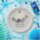"Rustic Gray Wood Navy Floral Pumpkin Baby Shower Paper Plate & Party Decor." Soft faded gray, weathered barn wood ship lap background with navy blue fall floral elements and gold glitter stars that swirl around the white pumpkin. The design is completed by greenery in muted earth tone autumn leaves. Hand painted in watercolor by internationally licensed artist, Audrey Jeanne Roberts. Complete set available to coordinate. Copyright.