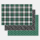 Rustic modern gift wrap set features three coordinating holiday wrapping paper sheets: classic forest green, white, and black watch plaid pattern, black with white script "Merry Christmas" text, and green with little white pine trees pattern.