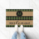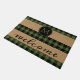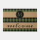 Fun doormat with contemporary black and green chequered plaid pattern on burlap background. Stylish rustic unique design with room to customise or personalise with your family name monogram. Original personalised monogrammed outdoor decor accent for decorating the front porch or yard of your country cottage house, log cabin, mountain lodge, fishing camp, lake or river vacation home.