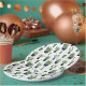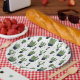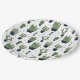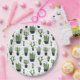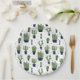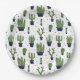 Paper plates with a rustic western flavour. Designed with a bunch of cute green cactuses in a repeating pattern. Specifically, green coloured prickly cactus, in all kinds of shapes and sizes, each sitting in its own dark blue flower pot. Little decorative triangles in between them. Whimsical fun illustration.