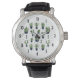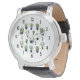 A watch with a rustic western flavour. Designed with a bunch of cute green cactuses in a repeating pattern. Specifically, green coloured prickly cactus, in all kinds of shapes and sizes, each sitting in its own dark blue flower pot. Little decorative triangles in between them. Whimsical fun illustration.