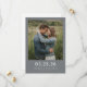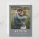 This wedding save the date features a heartfelt photograph of a couple embracing in a field, surrounded by tall grasses. The design is framed with a solid grey border and includes customisable text for the date and names, set in elegant serif fonts that add a touch of sophistication. The colour palette consists of natural greens and browns from the background, contrasted with denim blue, creating a rustic and intimate theme. The overall mood is warm and personal, perfect for celebrating love and togetherness on your special day.