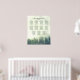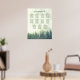 This elegant wedding seating chart has table assignments for 110 guests at 11 tables (10 people per table.) The design is rustic yet elegant, featuring a woodland mountain scene with a hillside covered in a foggy green pine tree forest. The title reads "please find your table" in lacy script calligraphy. There is space for the names of the couple and wedding date.