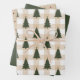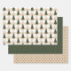 A collection of coordinated holiday wrapping papers. One features a beige gingham background with a green Christmas tree pattern, the second is a tan background with a burnt red polka dot pattern and the third is a coordinating solid green. Mix and match.