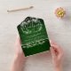 All in one wedding invitation featuring pretty string lights, a hand-drawn floral garland and chic typography on a rustic emerald green wood panels background. The invitation includes a perforated RSVP with your wedding website QR code and details. Designed by Thisisnotme©