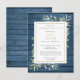 A personalised celebration of life remembrance invitation postcard featuring watercolor greenery on a rustic blue wood panels background. Designed by Thisisnotme©