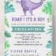 Amaze your guests with this elegant baby shower invite featuring cute little dinosaurs with detachable diaper raffle card. Simply add your event details on this easy-to-use template to make it a one-of-a-kind invitation.