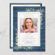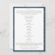 An order of service funeral memorial program featuring greenery on a rustic blue wood panels background. Designed by Thisisnotme©