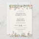 This rustic wedding invitation features watercolor top and bottom borders of delicate greenery. Personalise it with the names of the bride and groom in vintage charcoal grey typeface on an off-white background. The reverse side repeats the border design and provides space for wedding details on a solid off-white background, along with a QR code guests can scan to visit your website and RSVP, which saves the cost of printing and mailing separate RSVP cards.