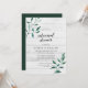 This rustic rehearsal dinner invitation features Italian Ruscus with the words "rehearsal dinner" in trendy script all against a pale wood background on the front and a dark green the back side.