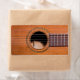 Detail guitar photo of strings and sound hole on a worn acoustic guitar.