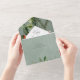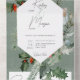 ALSO AVAILABLE WITH A QR CODE TO SCAN IN THE RSVP AREA OR WITHOUT DINNER SELECTION OPTIONS. This wedding invitation design features a beautiful frame of winter pine, holly, eucalyptus and other greenery with red holly berries. The background is a soft sage green that's distressed with white. Created by Simply Farmhouse Press.