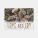 Festive, rustic pine cones accentuate this classic, elegant design wishing holiday Love and Joy.