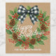 This beautifully designed holiday wine bottle label showcases elegant watercolor artwork of a wreath embellished with a black and white buffalo lumberjack checkered bow, pinecones, green holly leaves, red berries, and pine needles. Its classy yet rustic design captures the essence of the December holiday season and appeals to those who appreciate artistic illustrations. The sticker offers customization options, allowing you to personalize it with your company name, family name, or individual names, and include a tailored seasonal greeting, making it a thoughtful choice for spreading holiday cheer.