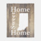 Elegant and warm light barn wood planks with the words "Home Sweet Home" in white alongside a white silhouette of Indiana!