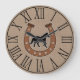 Rustic horseshoe and black horse silhouette round clock with a faux burlap print background.