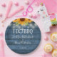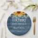 Pretty string lights and sunflowers decorate your special engagement party celebration details set in elegant typography on a blue rustic wood background. Designed by Thisisnotme©