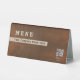 Step into the future of hospitality with a table tent sign that commands attention. Its rustic brown surface adds instant sophistication to every tabletop, ensuring your establishment stands out. Capture customer interest from the moment they sit down and set a tone of modern elegance.