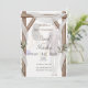 An elegant wedding invitation featuring a rustic wooden arch, white drapes, and a "Bismillah" header.