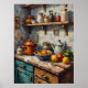 This painting depicts a cosy, rustic kitchen filled with various items in a still life arrangement. The artwork is chraacterised by its heavy impasto texture, with thick, expressive brushstrokes on all surfaces, from the distressed cabinets to the patterned walls. The scene features two wooden shelves holding an assortment of ceramic pots and jars, while the counter below is adorned with a bright orange pot, a bowl of citrus fruits, and a silver teapot. The painting evokes a warm, homey atmosphere with a charming, vintage feel.