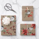 A rustic Kraft holiday wrapping paper featuring watercolour-painted black cap chickadee birds eating red ilex berries and resting on Christmas poinsettias in 3 separate repeat patterns.