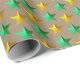 A rustic kraft wrapping paper for the Christmas holiday featuring bright green and gold stars in a repeat pattern on a warm kraft paper.