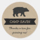 Kraft brown and black woodland camping birthday party thank-you favour stickers with a rustic texture. Includes an image of a bear, personalised with your child's "camp" name, and a customisable message that currently reads "Thanks a tonne for joining us!"