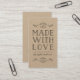 Stylish rustic vertical social media kraft business card with the words "Made with Love" between flourishes all in dark grey. This stylish handmade business card is ideal for crafters and makers of handmade goods, like artists, knitters, dressmakers, etc who want a way to let the people they meet in real life know how to find them and their work/portfolio online and on social media. This versatile card can also be used as a product tag for your handmade goods.
