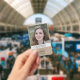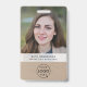 Simple, stylish corporate rustic kraft ID badge which can easily be personalised with your employee's ID photo, name, position, company logo, business details and QR code or barcode. The stylish design features modern minimalist typograhy and a transparent banner. The image shown is for illustration purposes only to be replaced with your own photo. The placeholder image is of a young woman in a brown jacket with long hair.